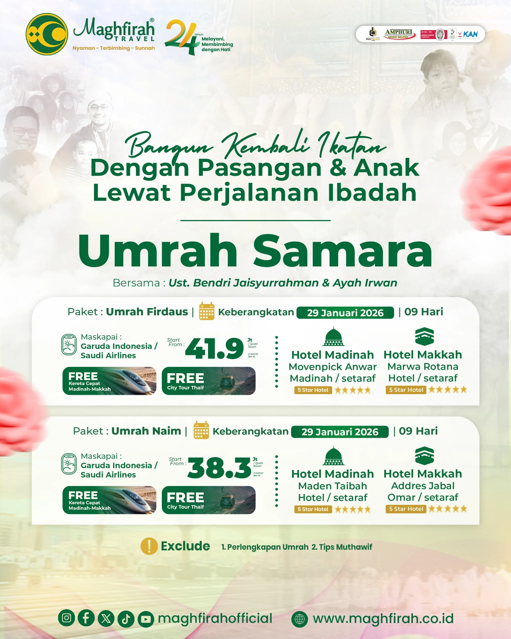 Awali 2026 dengan perjalanan istiwewa ke Tanah Suci selama 9 hari. Beribadah umrah sekaligus menguatkan ikatan hati antara anggota keluarga sambil dipandu oleh Ust. Bendri Jaisyurrahman (Pakar Parenting Islami) dan Ayah Irwan (Praktisi Keayahan).